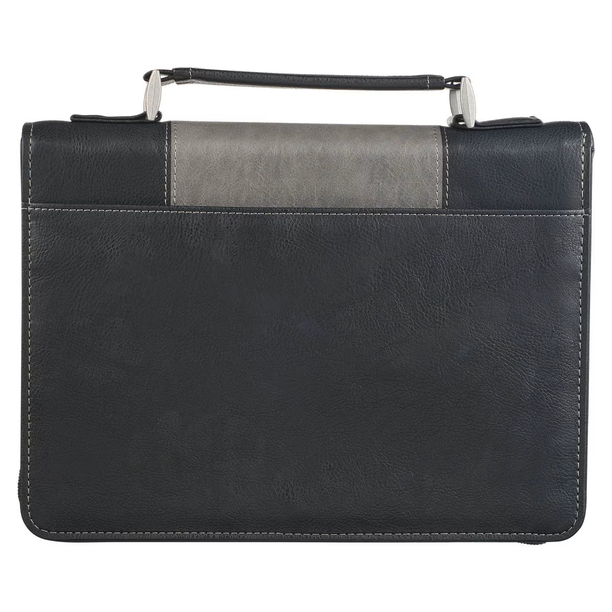 The Walk by Faith Black and Gray Faux Leather Classic Bible Cover is part of the Black and Gray Walk by Faith Collection designed to encourage men to stand firm in their faith. This collection also includes a ceramic coffee mug, stainless steel travel mug, a genuine leather wallet, and a faux leather journal.