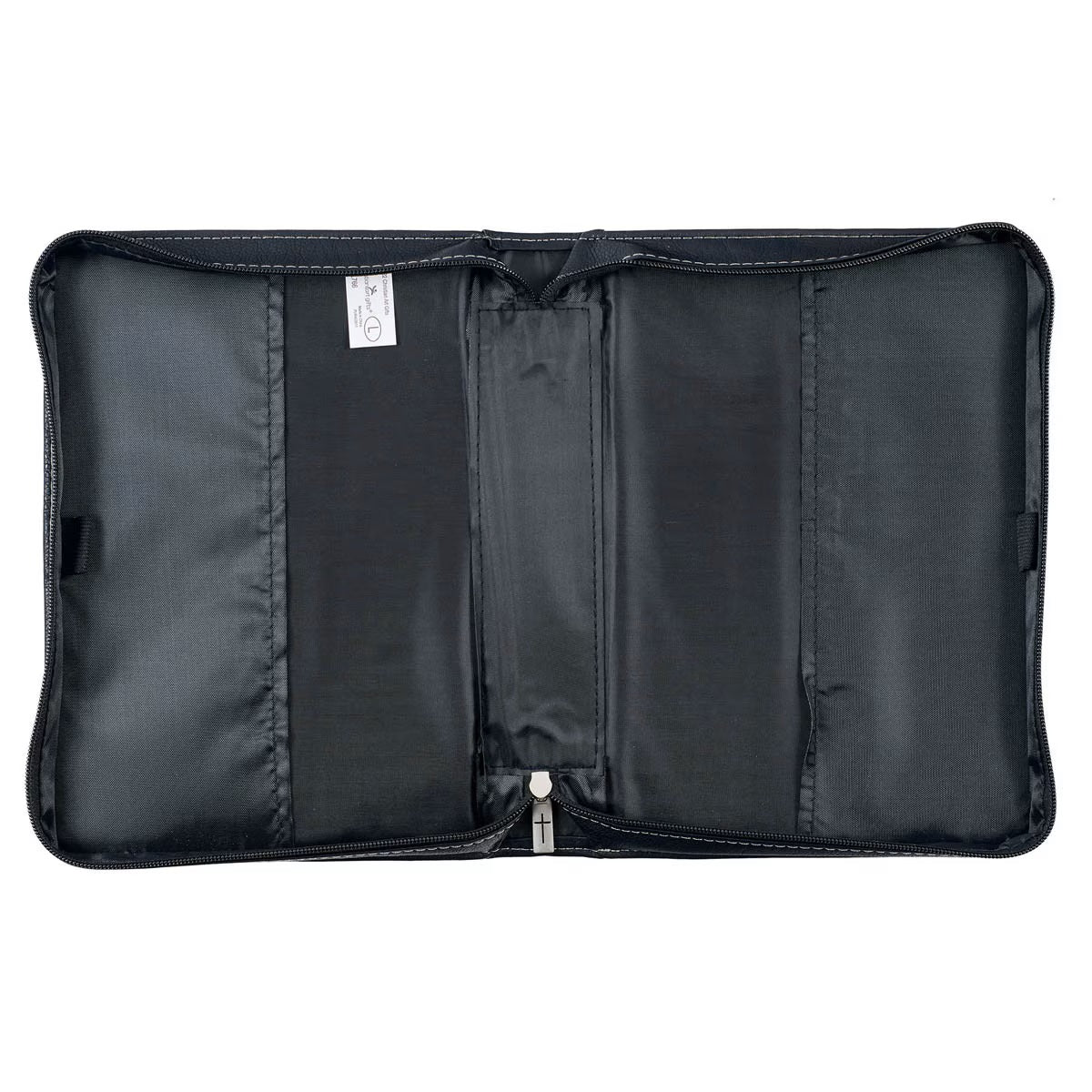 The panels wrap around the spine, where a sturdy lay-flat handle is attached with silver handle hardware, and disappear behind a black slip pocket on the back panel of the cover. The slip pocket is edged in gray topstitching. A silver metal zipper pull attached to a black zipper ensures the cover closes smoothly. Two pen loops are included inside the Bible case to store pens or highlighters.