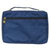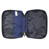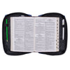 The Bible cover opens completely flat thanks to a lay-flat spine handle constructed from the same durable fabric. A black zipper with a cross-engraved brushed gold zipper pull closes tightly to keep valuables inside. An exterior zip pocket with a cross-engraved zipper pull is added to the back panel to store loose papers and even Kleenex. Two pen loops and two slip pockets to hold the outer covers of the Bible can be found inside.