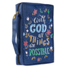The durable fabric used to construct the navy Bible cover is waterproof and screen printed with a full-color floral design. The flowers in the design are strewn around the playfully arranged title with its colorful lettering outlined in white. The title is taken from Matthew 19:26.