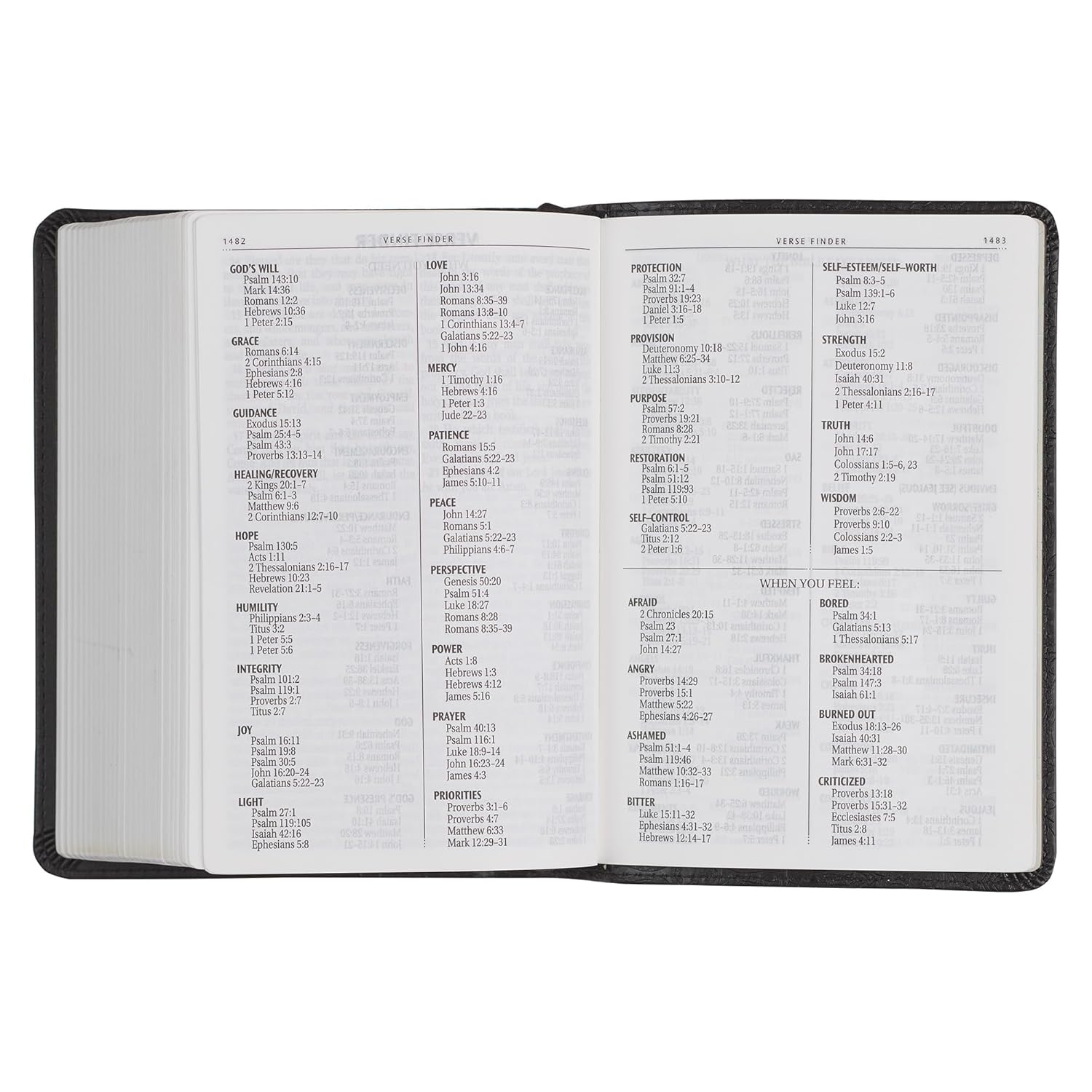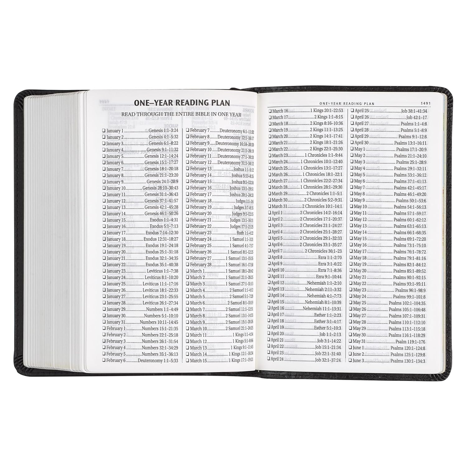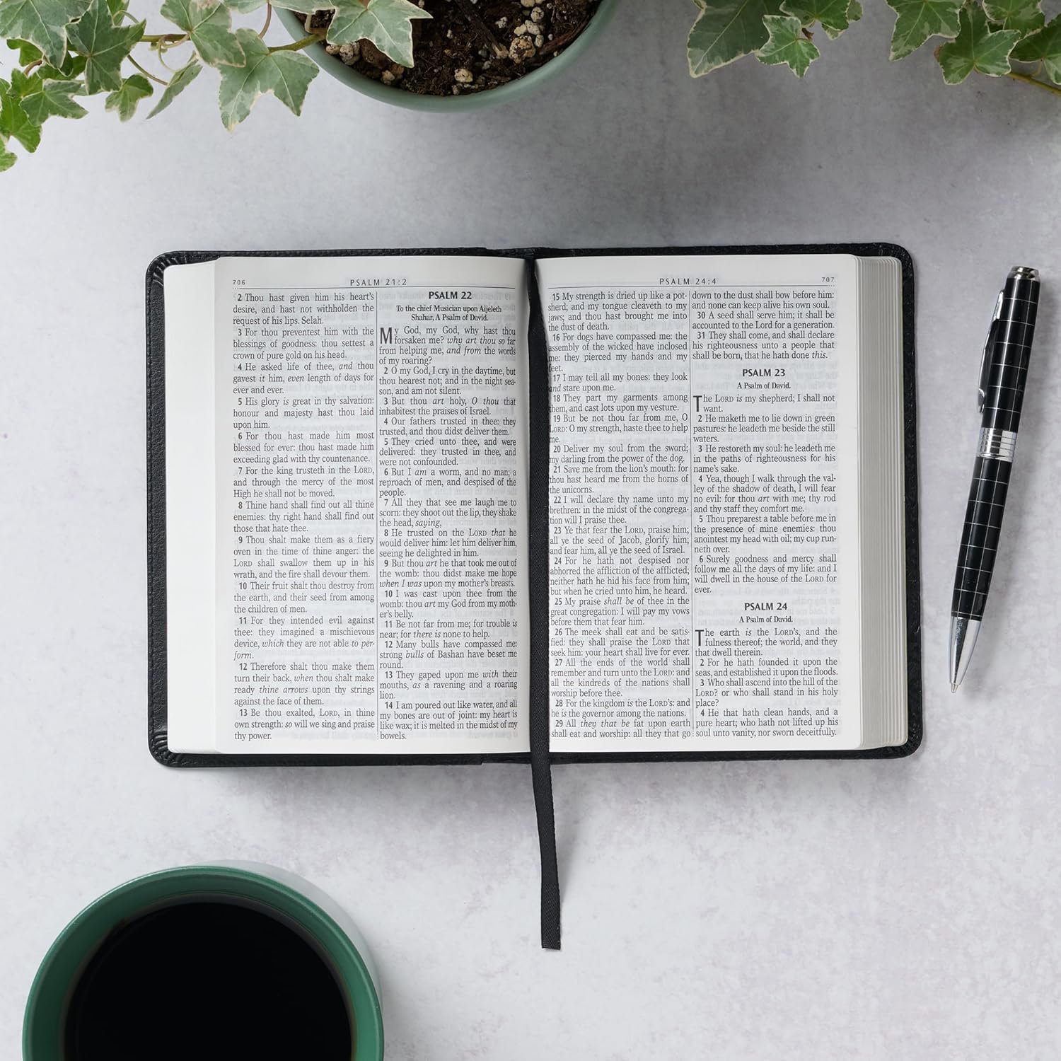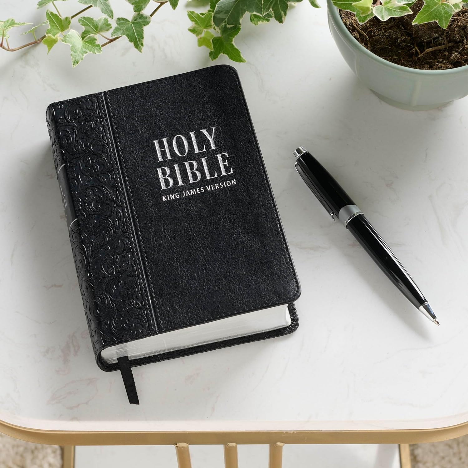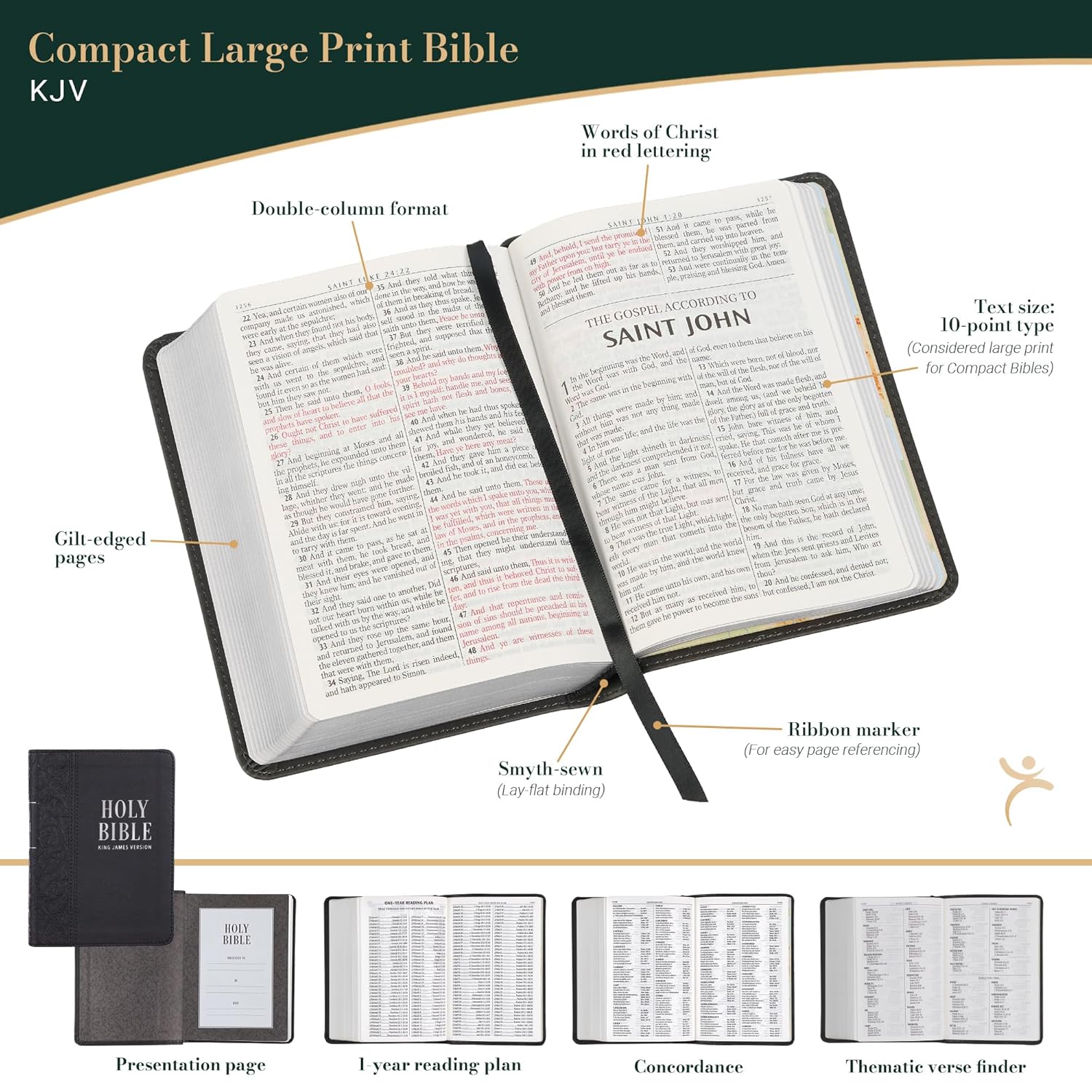 The Black Faux Leather Large Print Compact King James Version Bible makes a luxurious gift to mark a special occasion like a baptism or confession of faith. Give it as a Christmas or birthday gift to a father or grandfather who likes to read his Bible on the go. The Black Faux Leather Large Print Compact King James Version Bible is an excellent gift for travelers who cannot carry large books but prefer to read their Bibles in book format rather than on an app.