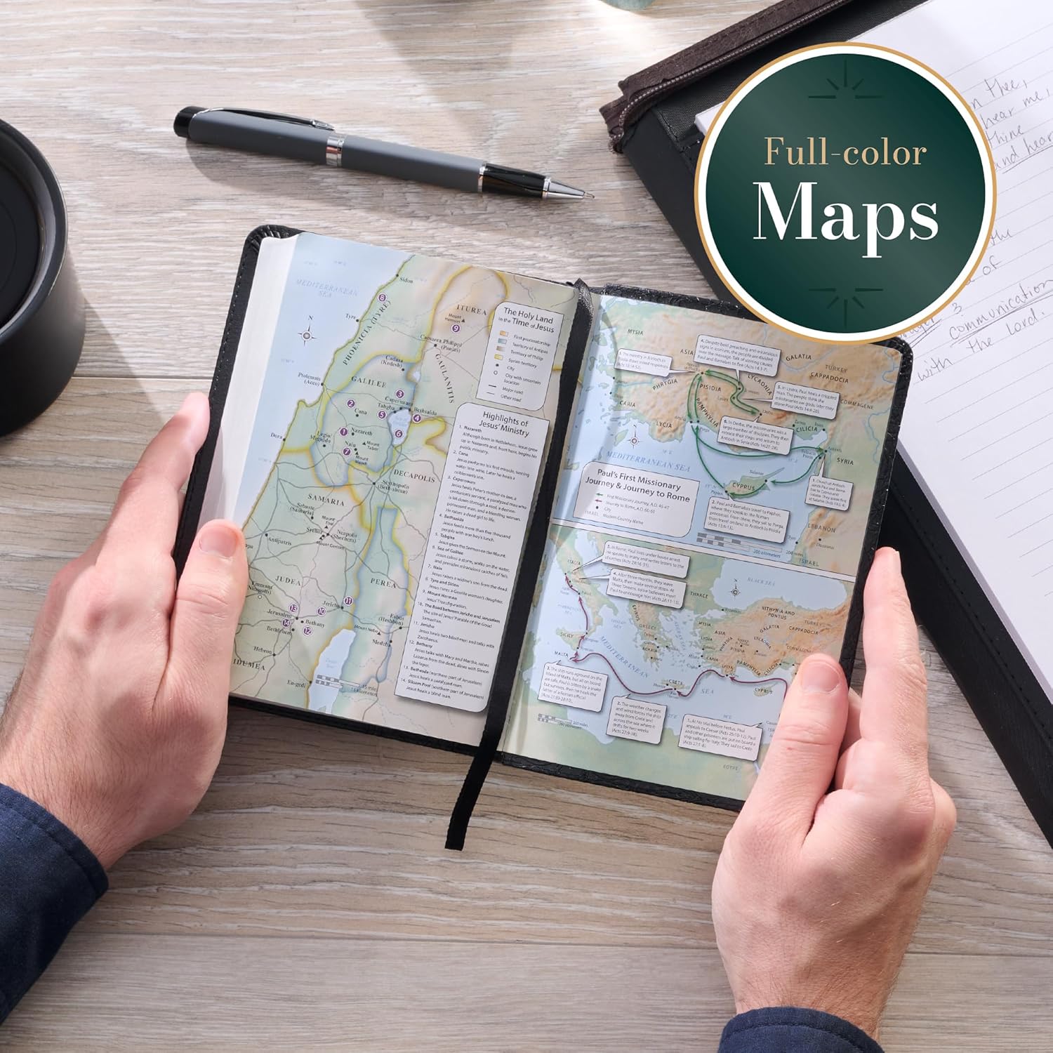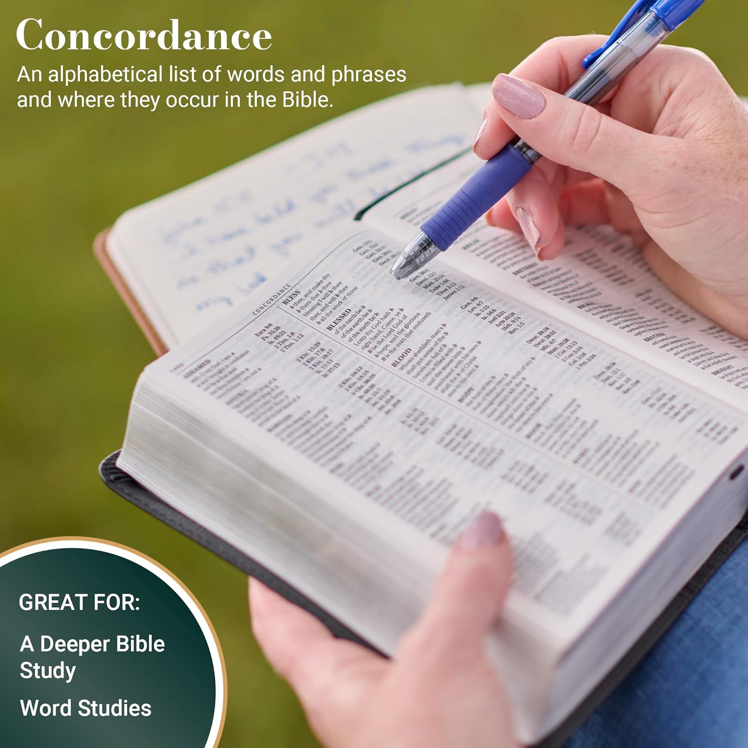 Inside, you'll find the text presented in a double-column format, the words of Christ printed in red ink, a concordance, a thematic Scripture verse finder, a one-year Bible reading plan, and eight full-cover maps. A presentation page is included for you to mark a special occasion when you present this Bible as a gift.
