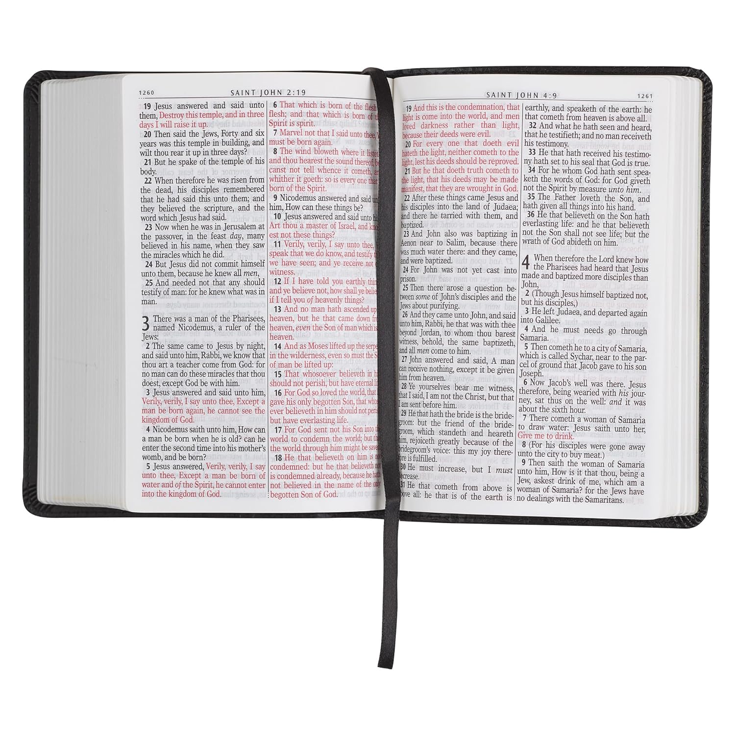 The Black Faux Leather Large Print Compact King James Version Bible has an easy-to-read print and is just the right size to slip into a handbag or briefcase. Although the Bible itself is much smaller, the 10 pt. text is slightly larger that the text of a standard size Bible (8 pt).