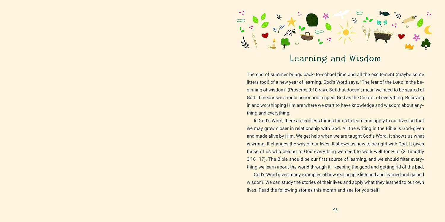 Each section includes 4 colorfully illustrated Bible stories that reinforce the monthly theme and show kids how God worked in the lives of Bible men and women--and how He works in the lives of people today!