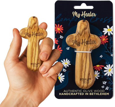 This handheld comfort cross is hand crafted from beautifully grained olive wood in the Holy Land of Bethlehem. Each comfort cross is laser engraved and has softly rounded edges for maximum comfort in the palm of the hand.
