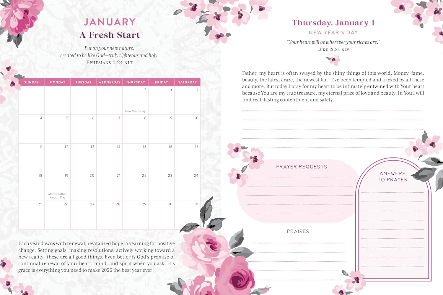 My Daily Prayer Plan will help grow a vibrant prayer life while keeping a record of your faith journey throughout 2026.This dated, interactive prayer tracker gives you the perfect place to record your conversations with God throughout the year. Each month opens with a calendar and devotional encouragement. Every day includes a scripture and short devotional prayer starter that focuses on themes like Faith, Wisdom, the Future, Praise, and more! Every page offers dedicated journaling space for personal prayer, daily prayer requests, praises, and answers to prayers. Truly interactive, My Daily Prayer Plan: 2025 Edition will leave you with a lasting record of how God worked in your life all year long.