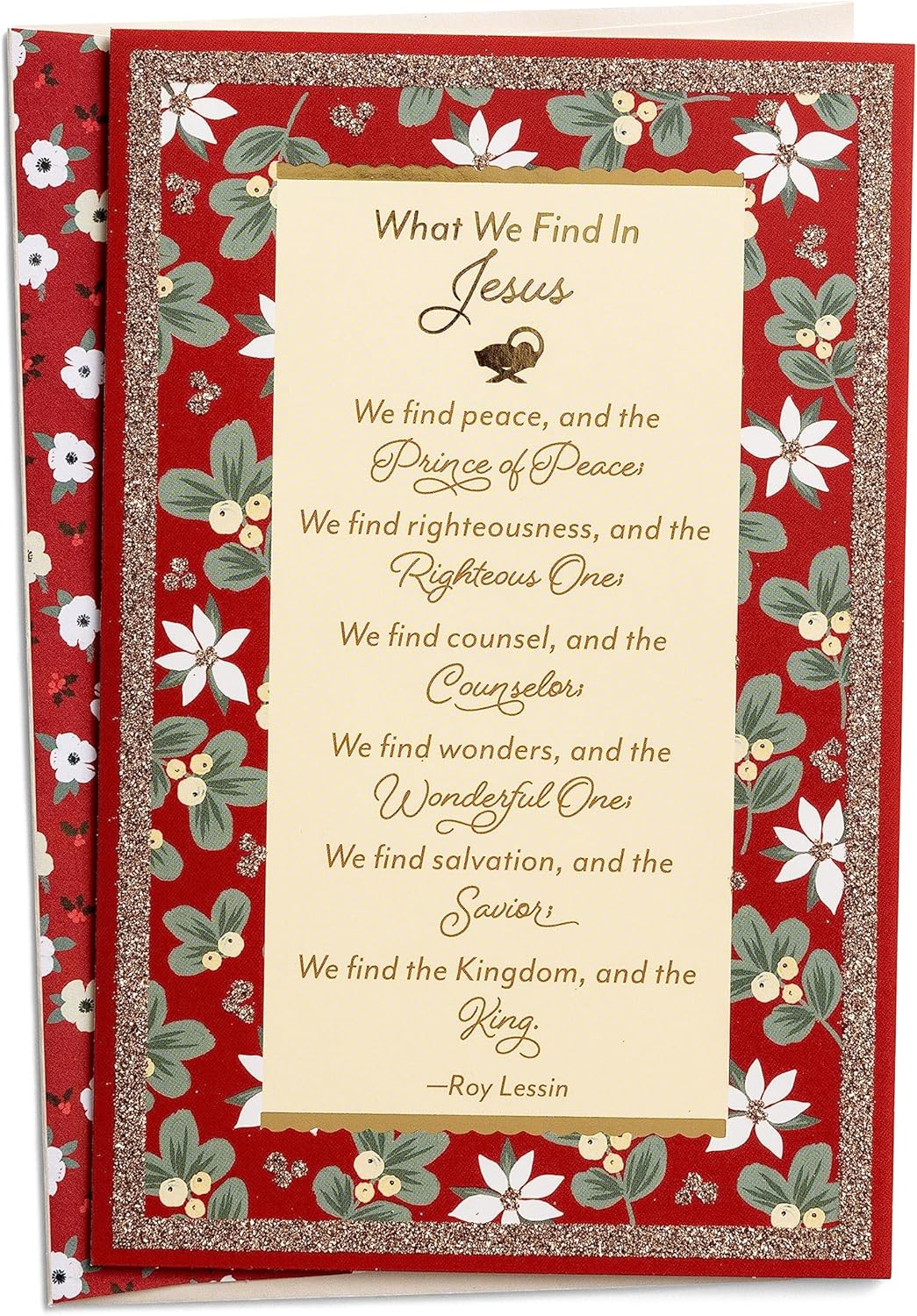 Cover: What We Find In Jesus We find peace, and the PRINCE OF PEACE; We find righteousness, and the RIGHTEOUS ONE; We find counsel, and the COUNSELOR; We find wonders, and the WONDERFUL ONE; We find salvation, and the SAVIOR; We find the Kingdom, and the KING.;—Roy Lessin Inside: In Jesus, we find more gifts than our hearts can imagine. Wishing You A Blessed Christmas Scripture: For in Christ the fullness of God lives in a human body. Colossians 2:9 NLT