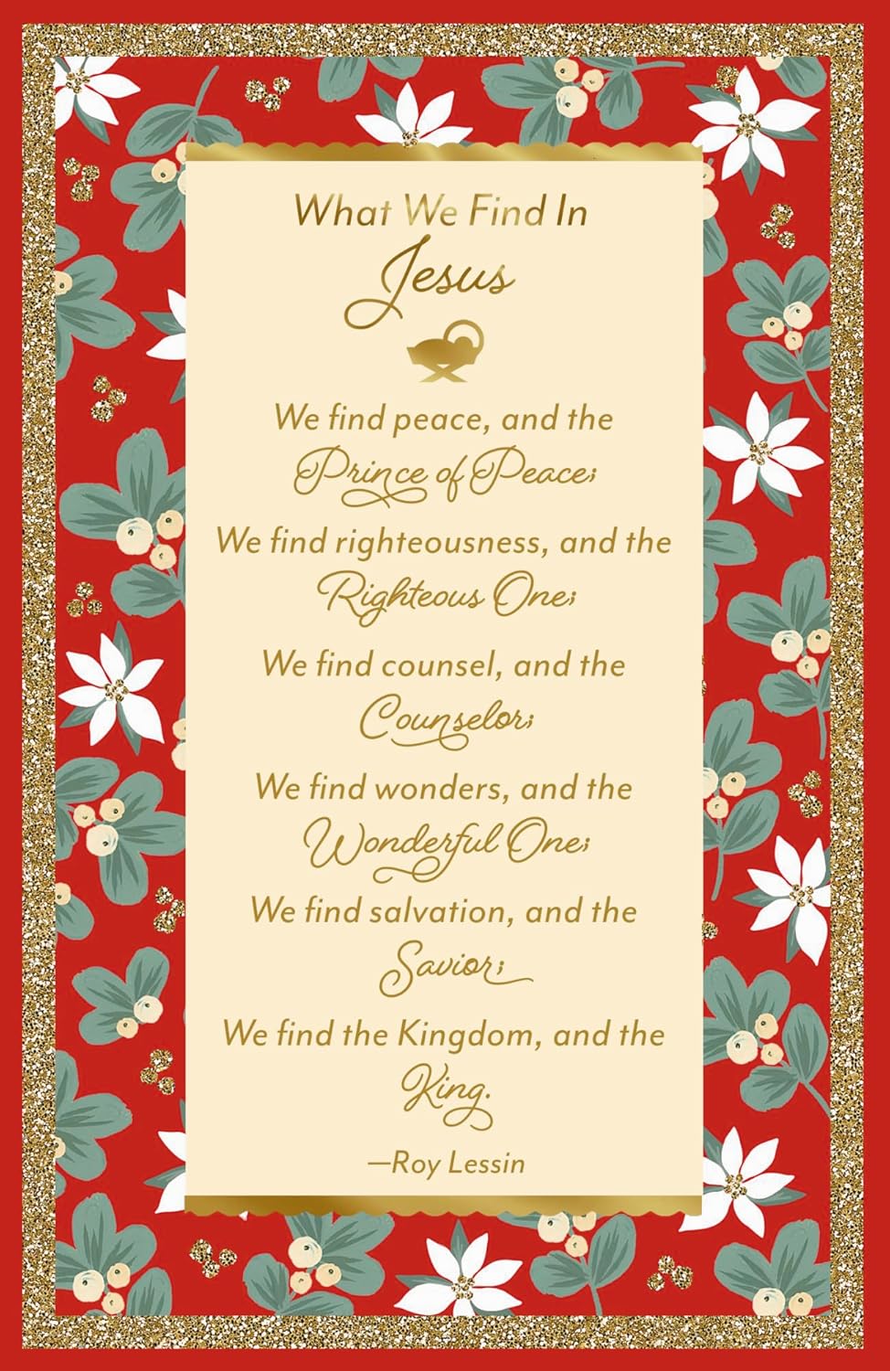 DaySpring's What we Find in Jesus inspirational Christmas cards is a set of 18 Premium Christmas Boxed Cards and Envelopes that beautifully celebrates the birth of Jesus and the blessings we have in our Savior. These elegant red and gold Christmas cards feature a festive Christmas floral border, baby Jesus in the manger, an inspirational quote by DaySpring cofounder Roy Lessin, highlighting the peace, righteousness, counsel, wonders, and salvation we find in Jesus with a Scripture from the New Living Translation of the Bible. These greeting cards offer a meaningful and beautiful way to share the message of Christmas and the abundant blessings found in Jesus.