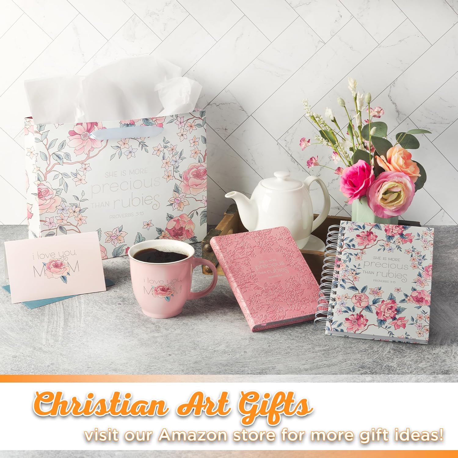 The More Precious Than Rubies Pink Floral Large Landscape Bag with Card is part of the Precious Rubies Collection, designed to celebrate the wisdom of mothers. This collection also includes a ceramic coffee mug, wirebound journal, and a faux leather journal.