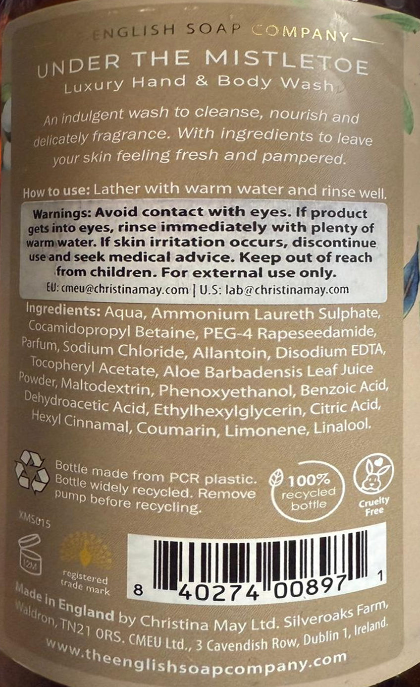 Experience luxury self-care with this Christmas Tidings Under the Mistletoe Hand and Body Wash. Beautifully fragranced and expertly crafted from high quality ingredients, enriched with aloe vera and vitamin E. This vegan-friendly hand and body wash produces a silky lather that scents and nourishes your skin. Presented in recyclable 100% PCR plastic bottles adorned with charming illustrations, our hand and body washes make the perfect gift or indulgent treat for yourself.