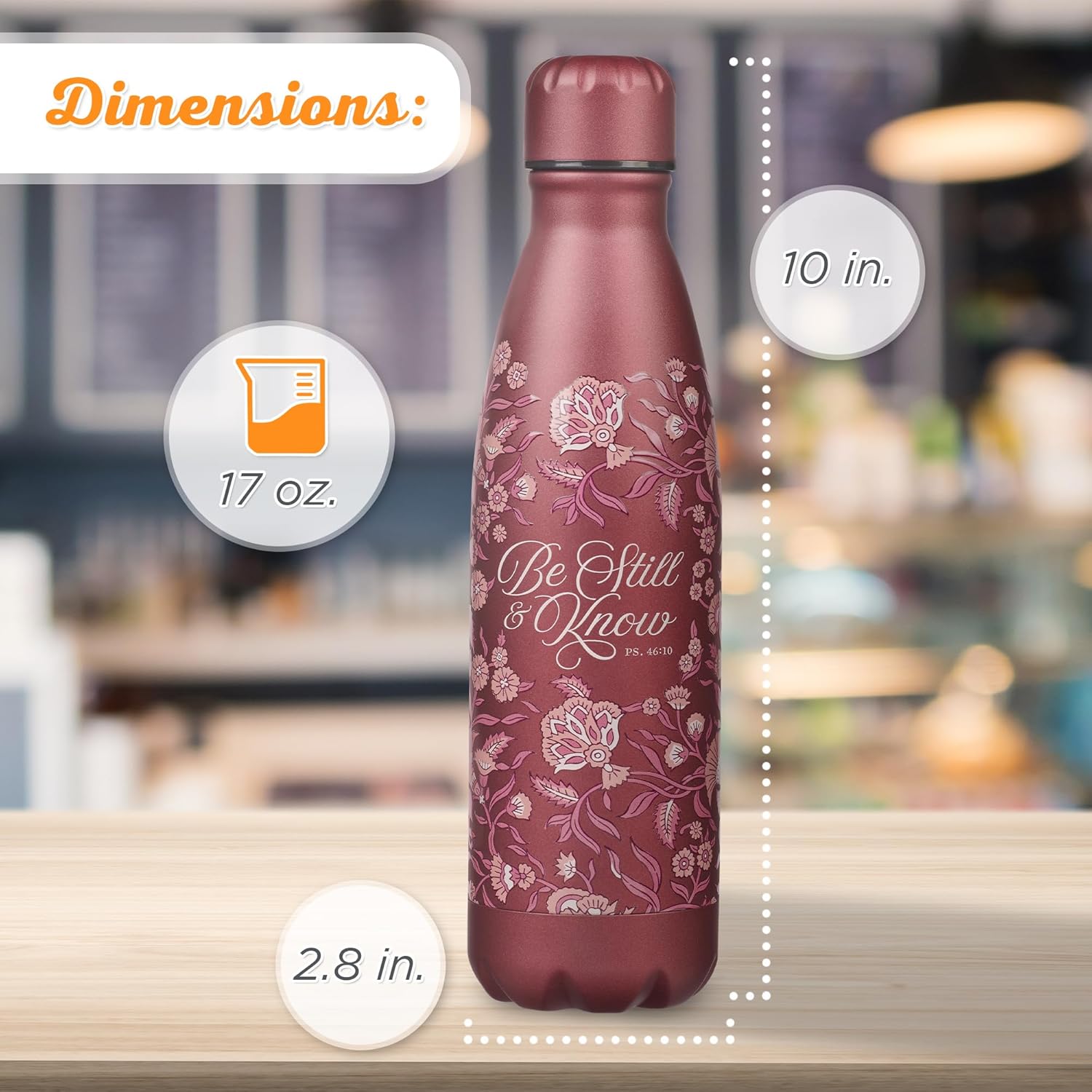 The Be Still Metallic Raisin Plum Floral Stainless Steel Water Bottle will remind a friend or sister that God is sovereign over every detail of life and that growth often stems from adversity.