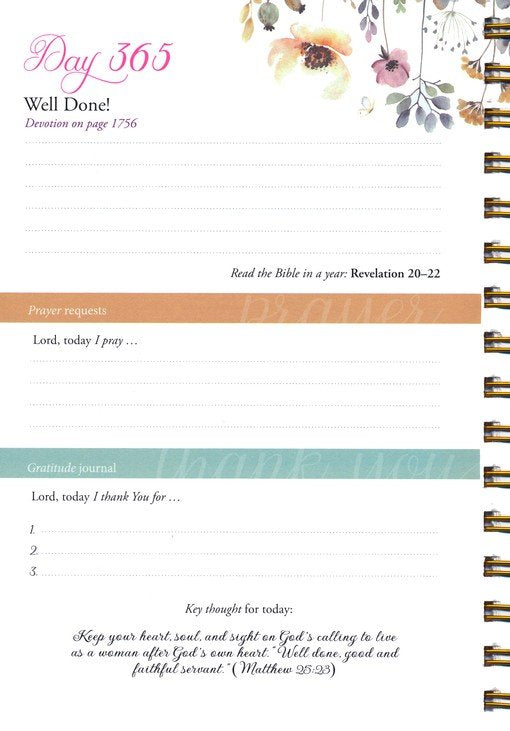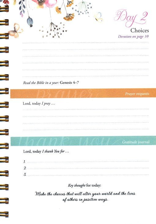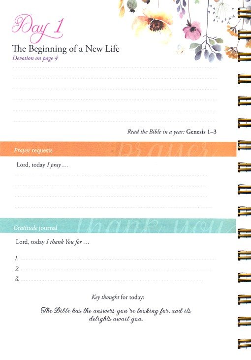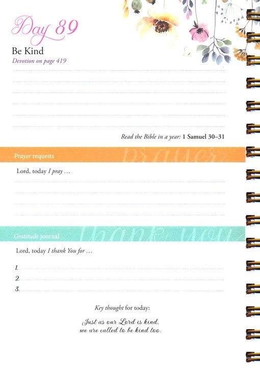 All 365 days of the year can be found in these spiral bound pages. Each entry includes the page number that corresponds to the devotional in the Bible, and offers the scripture passage for those who want to reach their goal of reading the entire Bible in one year. With spaces to write new thoughts on the devotion of the day and to include a personal prayer, it offers a deeper connection to each passage and a fuller understanding of the Word. Elizabeth also includes a spot to write a note of gratitude each day, and then offers her own "Thought of the Day."