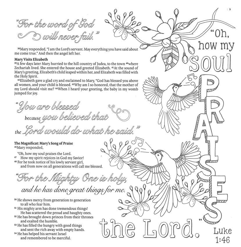 - 65 all-new line-art illustrations to color, including 13 full-page Scripture designs