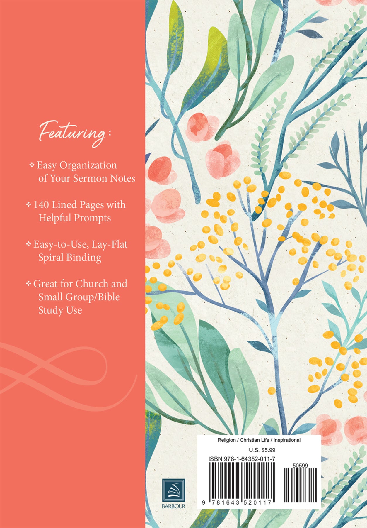 The Perfect Keeper of a Year's Worth of Sermon Notes! This attractive spiral-bound journal offers 140 pages of writing space, with helpful prompts for your thoughts organized. Featuring generous space for note-taking and a user-friendly lay-flat feature, this notebook is sure to become a must-have in the pocket of your Bible cover!