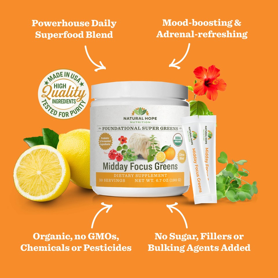 For those mentally demanding days when you need a pick-me-up to get you through that “Midday slump”… WITHOUT added Caffeine! Like our Morning Greens, this concentrated blend helps fill your daily nutritional gaps while adding Mood-boosting and adrenal-refreshing ingredients like Lion’s MANE and Coconut Water. When everyday feels like Monday, reach for Midday Focus Greens! Also available in a 6.9oz Canister.
