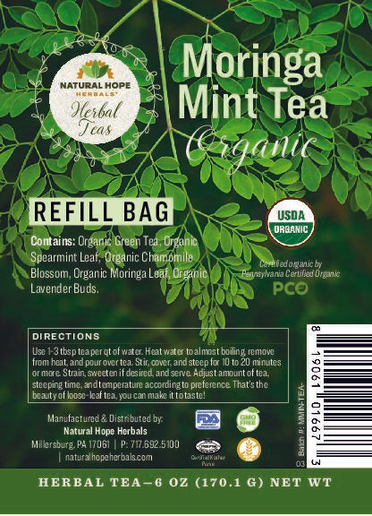 Our Moringa Mint Tea is a delicate and delightful blend of super-food Moringa (a powerhouse of vitamins and minerals), calming Chamomile and Spearmint, with antioxidant Green Tea. This is a great tasting tea that will remind you of Grandma’s Meadow Tea. It is also USDA Certified Organic.