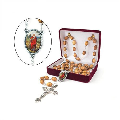 This rosary features an oval Jesus the Good Shepherd icon portrait, solid olive wood beads linked with sturdy chain, and an ornately detailed silver and gold dangling crucifix cross pendant. Each rosary includes a Certificate of Authenticity and is packaged in a high quality, gift ready plush velvet gift box.