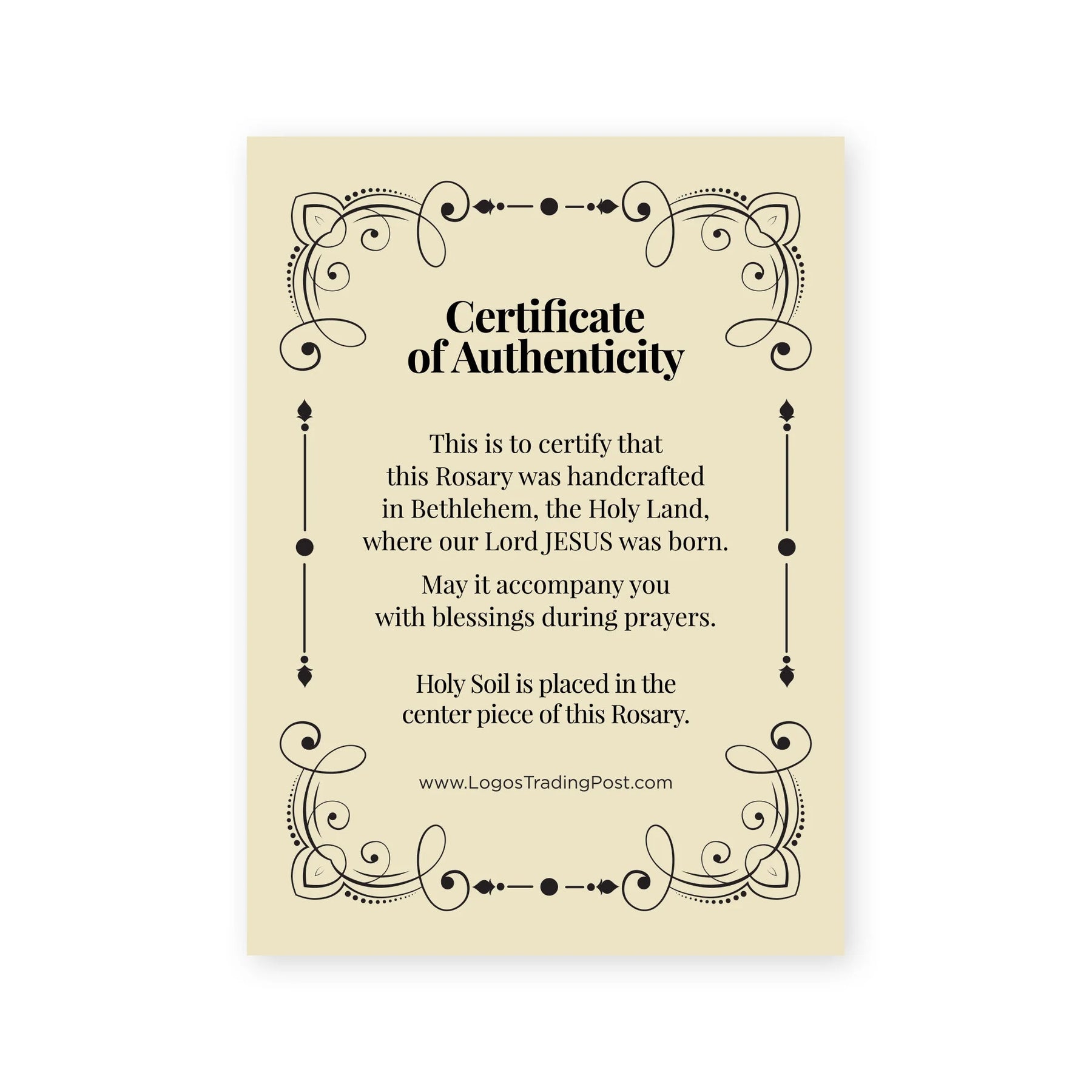 This beautiful, unique 22 inch rosary has beads crafted from Mother of Pearl, also called Nacre and is made in Bethlehem, Israel. It features an oval Jesus Divine Mercy medal, along with a dangling crucifix cross pendant at the end. Each rosary includes a Certificate of Authenticity and is packaged in a high quality, gift ready plush velvet gift box.