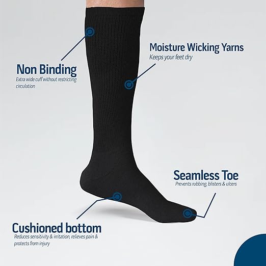 - OVER THE CALF SOCKS LENGTH:- The socks' convenient Over The Calf length provides additional leg support. Socks go all the way up to the knee and cover the entire calf. Knee-high diabetic socks are an excellent fashion choice for suits, and even shorts.
