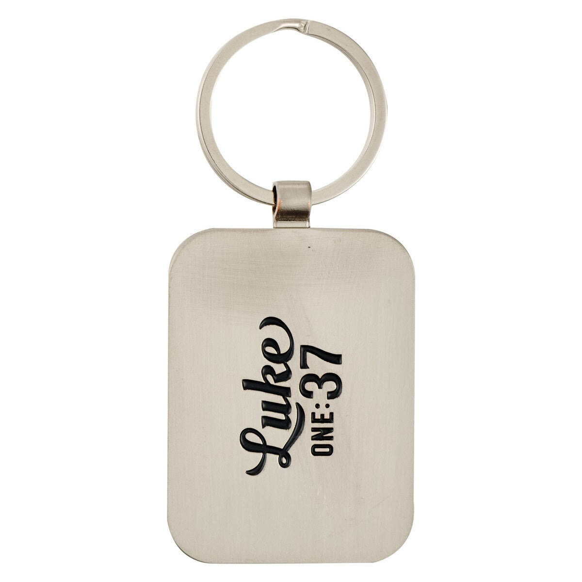 The keychain features a silver 1-inch split metal ring firmly attached to a rectangular medallion via a sturdy metal connector. This design makes it ideal for adding your house or car keys, access fob, or ID card, ensuring that you always carry a biblically inspired verse wherever you go.