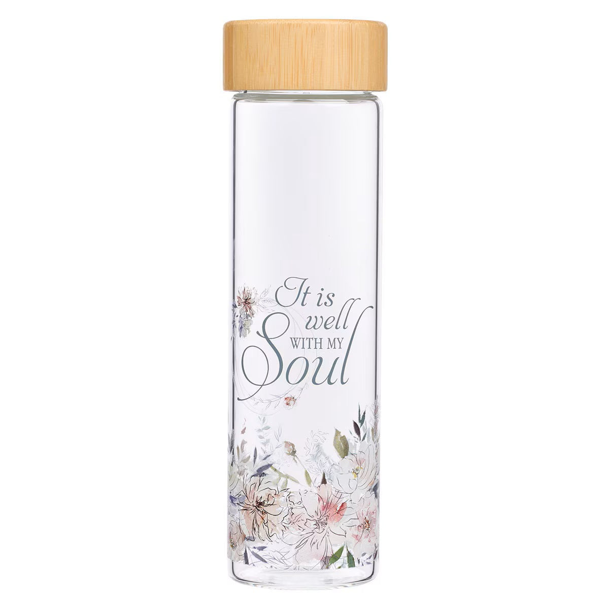 The It Is Well Glass Water Bottle with Sleeve is part of the It Is Well Hymn Collection that includes a ceramic mug, faux leather ID holder, faux leather bookmark, and zippered faux leather bookmark.