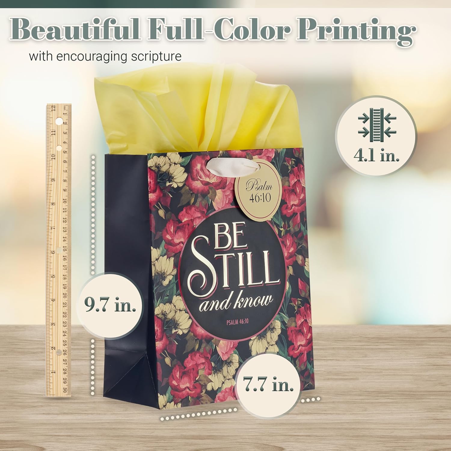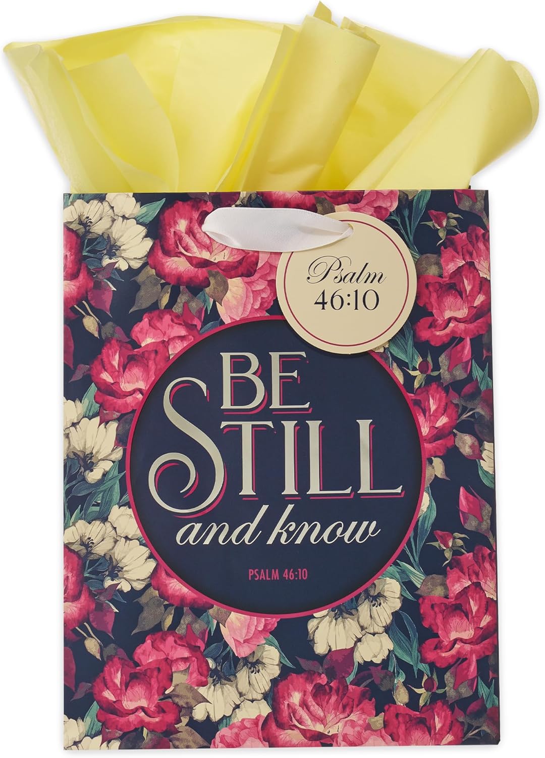 Midnight blue side panels offer a sharp contrast to the cream-colored satin ribbon handles and matching sheets tissue paper. Also included is a cream-colored attached gift tag imprinted with the Scripture reference for the sentiment.
