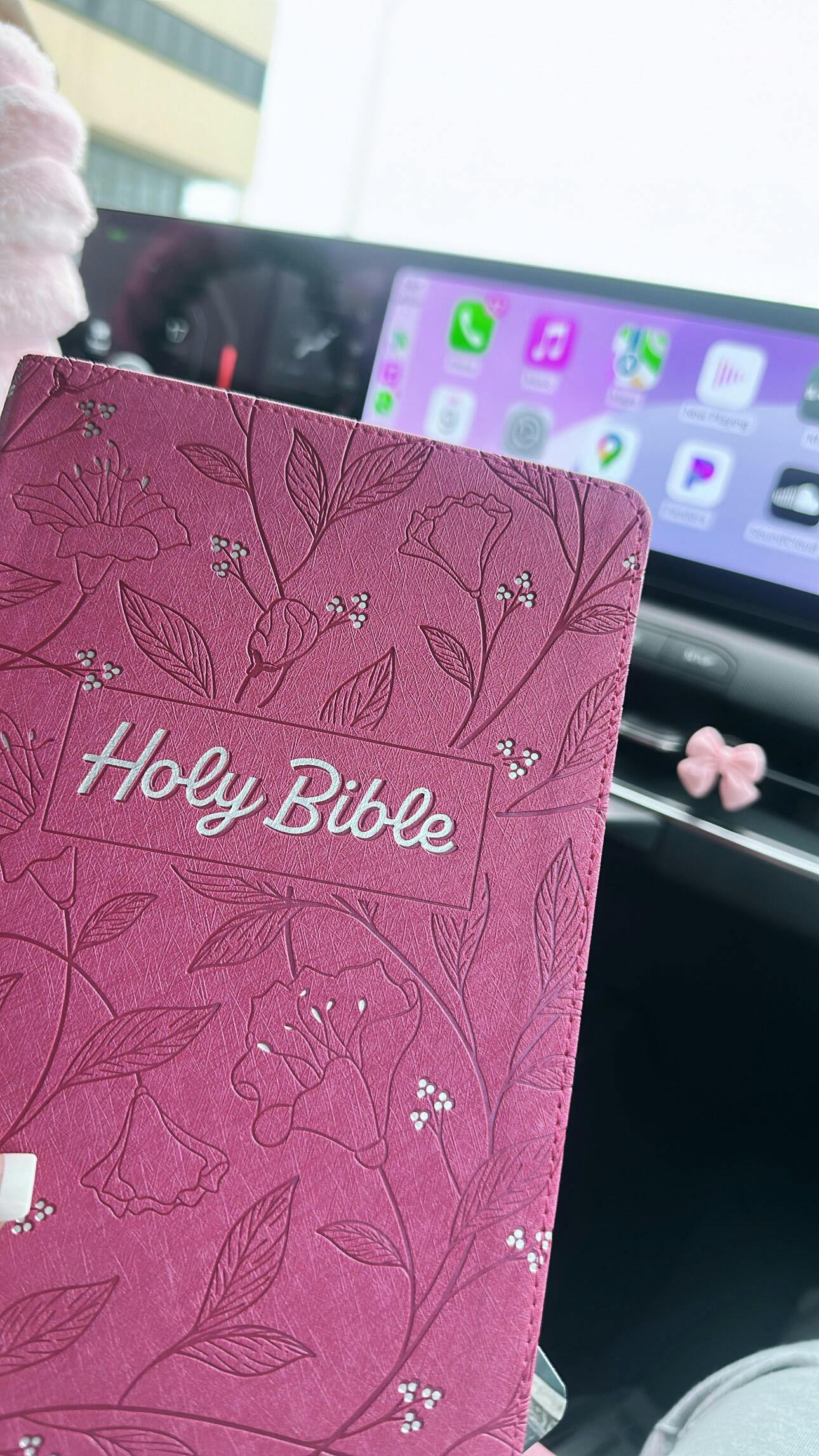 The pretty silver sprayed page edges not only lend an elegant touch to the design but also provide protection against dust and moisture, ensuring the longevity of the pages. Additionally, cherry pink topstitching along the edges of the cover enhances the strength and durability of this Bible. The Bible is protected by a full-color printed cardboard sleeve.