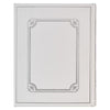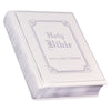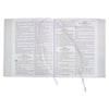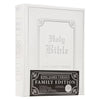 The white faux leather cover of the hardcover family Bible features a silver-foiled double frame with corner scroll designs set within a larger silver-foiled frame with elaborate heat-debossed scroll details. The silver-foiled title and version reference of the Bible are centered on the design.